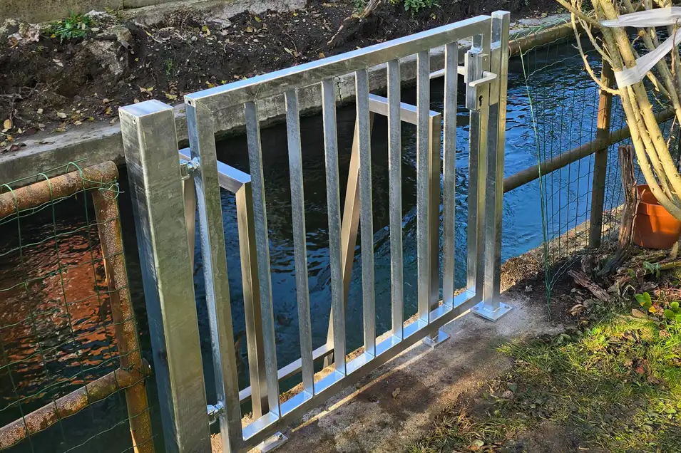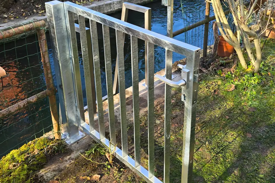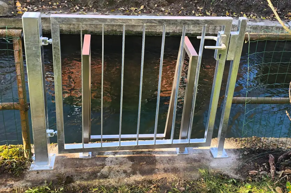 Diese Absperrtür wurde als sichere Zugangslösung für einen Bachbereich gefertigt. Die Konstruktion aus Baustahl S235JR mit feuerverzinkter Oberfläche bietet zuverlässigen Korrosionsschutz und hohe Stabilität im Außenbereich. Die Tür ist passgenau gefertigt, über massive Bänder an einer Stahlstütze montiert und für bauseitige Schließtechnik vorbereitet. Eine funktionale Lösung, bei der Sicherheit und Langlebigkeit im Vordergrund stehen.