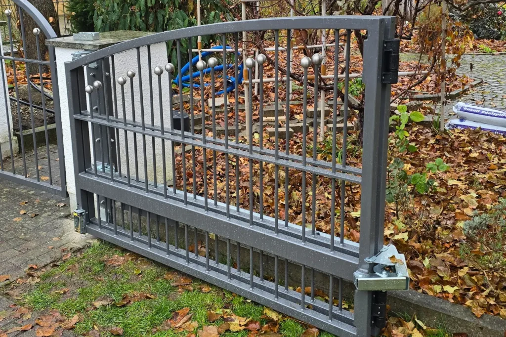 Dieses maßgefertigte Hoftor wurde exakt an den Rundbogen des vorhandenen Durchgangs angepasst. Gefertigt aus klassischen Schmiedeelementen, kombiniert es Funktionalität mit stilvollen Designelementen: Ein geschwungener Unterbogen mit senkrechten Stäben, zentrale Zierornamente in Blätterform und eine Oberfläche in elegantem RAL 7011 (Eisengrau). Das einflügelige Tor bietet Sicherheit und Ästhetik gleichermaßen – ein Blickfang für jedes Grundstück.
