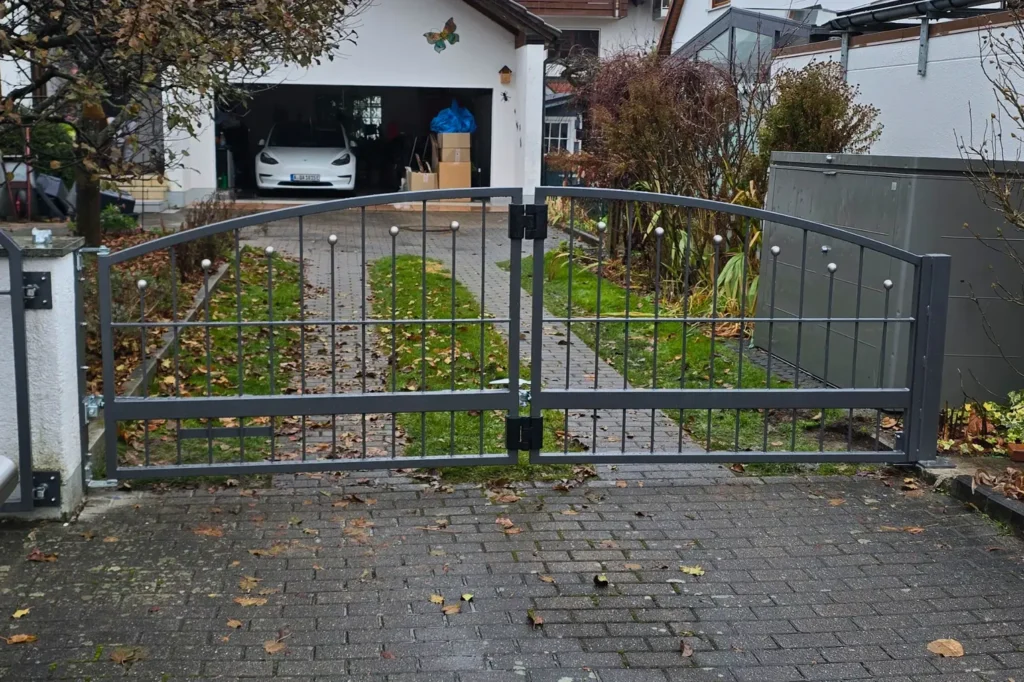 Dieses maßgefertigte Einfahrtstor aus Stahl wurde passgenau an den bestehenden Zaunverlauf angepasst und überzeugt durch seine besondere Faltfunktion.